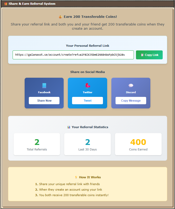 Advanced Security: Our system includes sophisticated fraud prevention and continuous monitoring to ensure fair play for everyone. Ready to start earning? Visit your Account Management page or read our complete Referral Guide for more details. Start building our community together while earning valuable rewards! 🌟 |